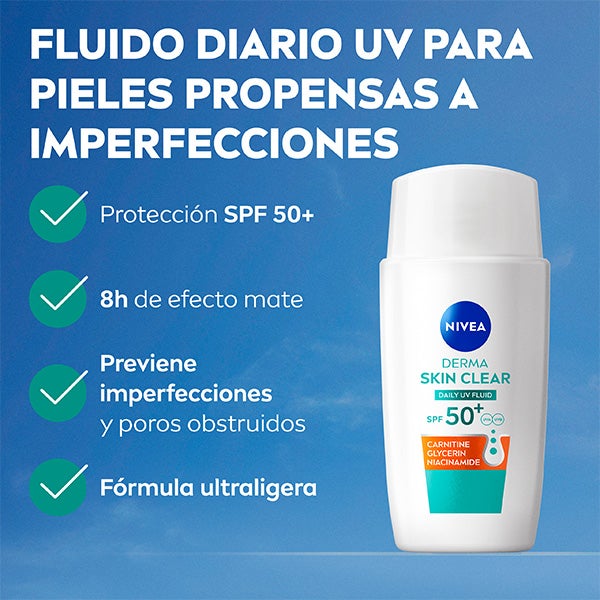 El Fluido Facial Derma Skin Clear FP50+ es un protector solar de textura ultraligera, formulado especialmente para pieles normales, grasas y con tendencia a las imperfecciones.