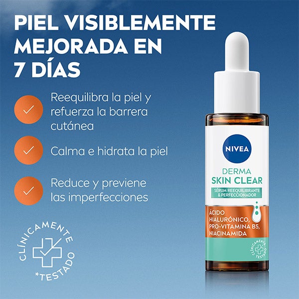 ¿Buscas reconectar con tu piel y mantenerla bajo control? NIVEA Derma Skin Clear Sérum Reequilibrante & Perfeccionador ha sido diseñado especialmente para pieles con tendencia a las imperfecciones.