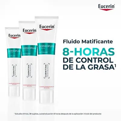 Eucerin DermoPure Clinical Mat Fluid es un tratamiento dermatológico diseñado específicamente para personas con piel grasa, mixta o con tendencia acneica. Su fórmula ha sido desarrollada junto a especialistas en dermatología y está clínicamente probada para regular el exceso de sebo durante hasta 8 horas, ofreciendo un acabado matificante duradero sin obstruir los poros.