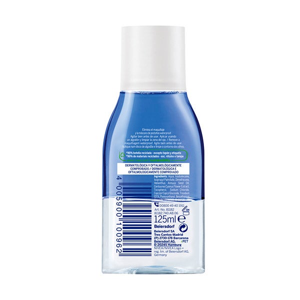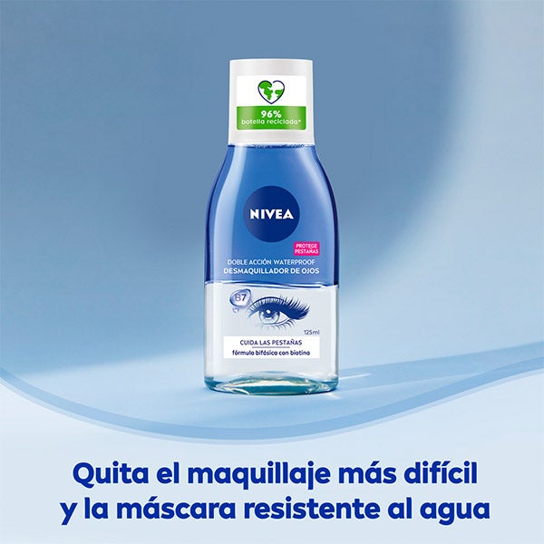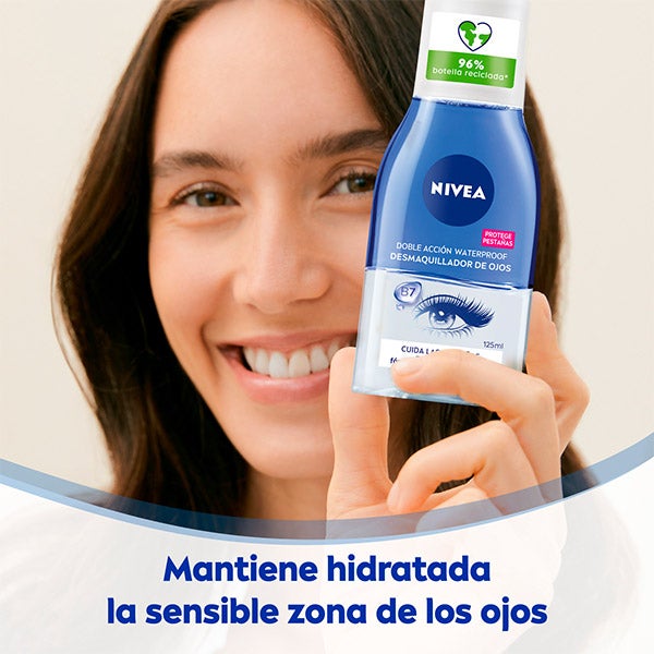 NIVEA Desmaquillador de Ojos Doble Acción retira con eficacia los residuos de maquillaje, incluso aquellos de larga duración, sin necesidad de frotar. Su fórmula bifásica, enriquecida con Flor de Aciano y Biotina, limpia a fondo la delicada zona del contorno de ojos mientras aporta un cuidado extra a las pestañas. Combinación perfecta entre suavidad y eficacia para eliminar fácilmente maquillaje y máscara waterproof.