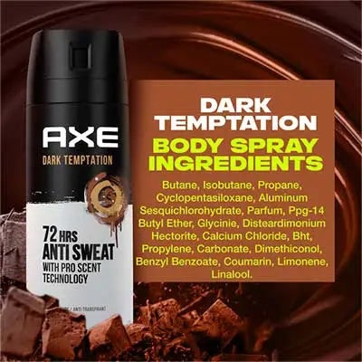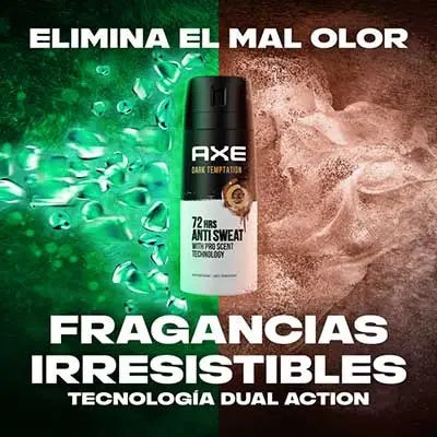 COMBATE EL MAL OLOR, FRAGANCIA IRRESISTIBLE. Disfruta de la fragancia AXE Dark Temptation con este incríble antitranspirante: dulce y sutil con una mezcla de chocolate caliente, ámbar, pimienta roja y un toque de especias que te ayudará a volverte tan irresistible como el chocolate.