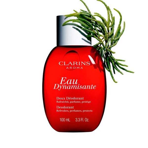 La emblemática Eau Dynamisante Clarins se presenta en formato desodorante en spray, ayudando a controlar y eliminar los olores de forma constante.
