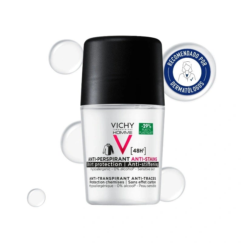 Desodorante antimanchas y antitransparente para pieles sensibles de Vichy. Proporciona una duración de hasta 48h.