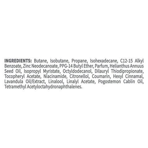 Butane, Isobutane, Propane, Isohexadecane, C12-15 Alkyl Benzoate, Zinc Neodecanoate, PPG-14 Butyl Ether, Parfum, Helianthus Annuus Seed Oil, Isopropyl Myristate, Octyldodecanol, Dilauryl Thiodipropionate, Tocopheryl Acetate, Niacinamide, Citronellol, Coumarin, Hexyl Cinnamal, Lavandula Oil/Extract, Linalool, Linalyl Acetate, Pogostemon Cablin Oil, Tetramethyl Acetyloctahydronaphthalenes