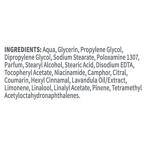 Aqua, Glycerin, Propylene Glycol, Dipropylene Glycol, Sodium Stearate, Poloxamine 1307, Parfum, Stearyl Alcohol, Stearic Acid, Disodium EDTA, Tocopheryl Acetate, Niacinamide, Camphor, Citral, Coumarin, Hexyl Cinnamal, Lavandula Oil/Extract, Limonene, Linalool, Linalyl Acetate, Pinene, Tetramethyl Acetyloctahydronaphthalenes
