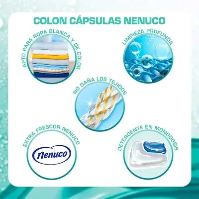 Colon Total Power Gel Caps Nenuco ofrecen una limpieza profunda y poder antimanchas para tu ropa con una fragancia fresca y duradera. Disfruta de la fragancia única de Nenuco en tu ropa blanca y de color.