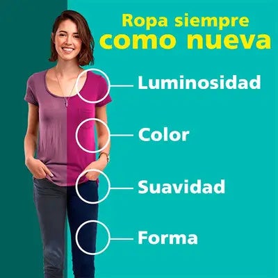 Máxima eficacia con la suciedad diaria con un extra de blancura y luminosidad. Mantiene la intensidad del color y evita las transferencias de colores. Mantiene el aspecto original de las prendas durante mucho más tiempo, evitando las roturas de fibras y las molestas bolitas. Previene la deformación y el encogimiento.