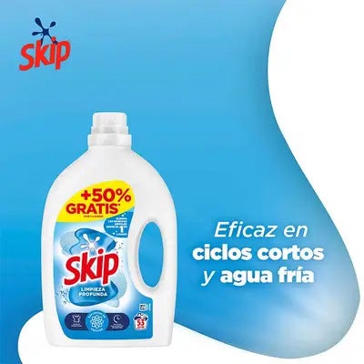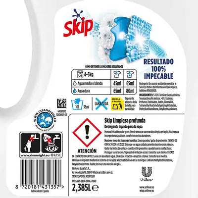 Con Skip Limpieza Profunda descubrirás una frescura y sensación de lavado que durará hasta el siguiente lavado. Está especialmente diseñado para cuidar tu ropa. Skip Líquido Limpieza Profunda quita las manchas de tu ropa respetando sus fibras y colores.