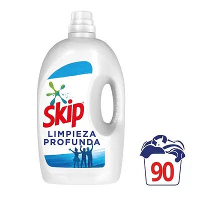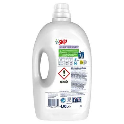 El detergente líquido Skip Limpieza Profunda te ofrece cuidado para tu ropa, frescura y sensación de recién lavado que perdura, a la vez que respeta las fibras y colores de tus prendas. Además, cuenta con nuevo envase elaborado con 50% de plástico reciclado y todo el envase es 100% reciclable. Su acción quitamanchas elimina fácilmente las manchas difíciles y la suciedad sin desgastar la ropa.