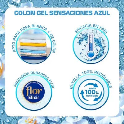 Colon Sensaciones Azul te ofrece una limpieza profunda incluso en agua fría, ofreciendo una increíble fragancia fresca desarrollada por Flor Elixir, para una colada limpia y fresca