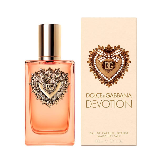 Dolce&Gabbana Devotion Eau de Parfum Intense se presenta en un frasco de vidrio ámbar de tono vibrante, realzado con el emblemático Sagrado Corazón, símbolo distintivo de la firma.