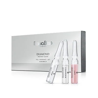 Natura Bissé Diamond Instant Glow es un tratamiento intensivo de tres pasos en formato de ampollas que ofrece una solución rápida y eficaz para revitalizar la piel, otorgarle luminosidad y atenuar los signos de la edad. Diseñado para adaptarse a cualquier tipo de piel, este trío es ideal para ocasiones especiales o para quienes buscan un efecto inmediato de "piel perfecta" en tan solo 10 minutos. Cada ampolla está formulada con ingredientes exclusivos y tecnologías innovadoras, características de la línea Diamond de Natura Bissé.