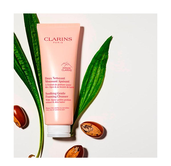 Esta espuma limpiadora, formulada con extractos de hierbas alpinas procedentes de la Hacienda Clarins, elimina el maquillaje, reconforta las pieles secas y limpia las impurezas sin alterar el equilibrio natural de la piel. Su combinación de ingredientes activos se ha seleccionado para atender las necesidades de las pieles muy secas o delicadas: la manteca de karité bio aporta hidratación y el extracto de camomila bio atenúa la sensación de tirantez. Incluye además el [Gentle Complex] de Clarins, compuesto por extractos bio de genciana amarilla y melisa que suavizan y calman la piel. El extracto de semilla de moringa ayuda a reducir la fijación de contaminantes cutáneos. Su textura, cremosa y confortable, se transforma en una espuma ligera y delicada. Para disminuir el impacto ambiental, Clarins ha rediseñado su envase utilizando un tubo más sostenible con una cápsula más liviana.