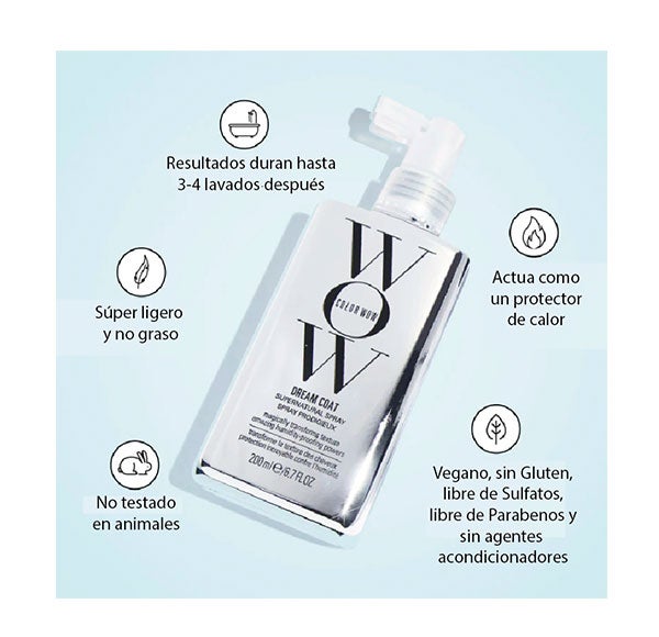 Logra una textura lisa y aterciopelada con el Spray Dream Coat Supernatural de Color WOW, un espray libre de siliconas que, además de controlar el encrespamiento, equilibra la hidratación y suaviza cada hebra de tu melena.