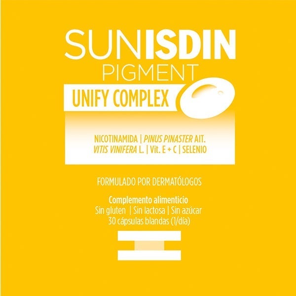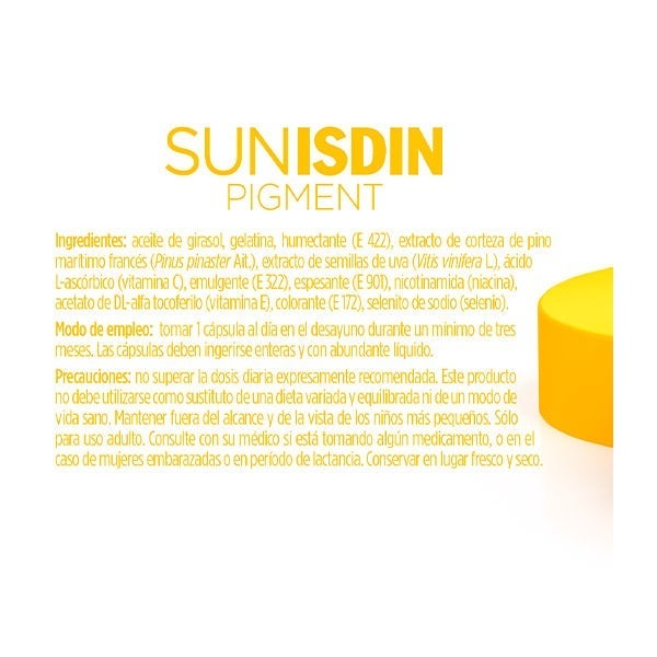 SunIsdin Pigment cápsulas es un suplemento nutricional formulado para cuidar la piel y contribuir a reducir la aparición de manchas provocadas por el sol.