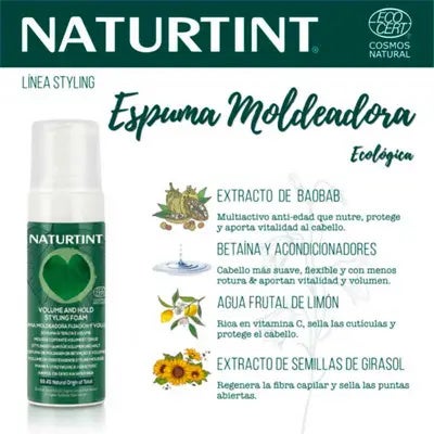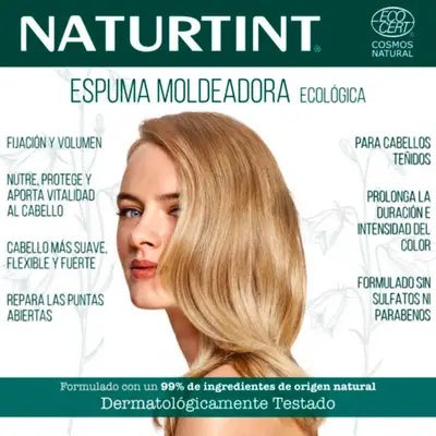Naturtint Espuma moldeadora con Certificación Ecocert formulado con un 99,4% de ingredientes de origen natural y orgánicos. Moldea y aporta estilo a tu cabello mientras lo reparas y proteges.