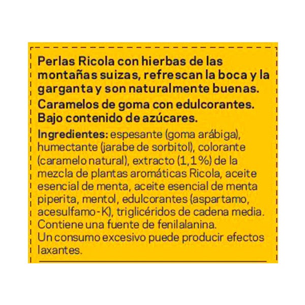 Espesante (goma arábiga), humectante (jarabe de sorbitol), colorante (caramelo natural), extracto (1,1%) de la mezcla de plantas aromáticas Ricola, aceite esencial de menta, aceite esencial de menta piperita, mentol, edulcorantes (aspartamo, acesulfamo-K), triglicéridos de cadena media.