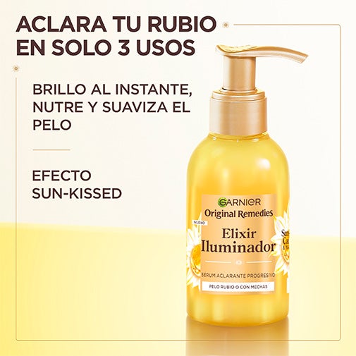 ¿Te gustaría conservar ese rubio dorado que el verano deja en tu melena? El Elixir Iluminador Sun-Kissed Camomila es la clave para mantener ese reflejo luminoso todo el año. Este sérum aclarante de acción gradual combina camomila y miel de flores, ingredientes de origen natural que ayudan a revitalizar los tonos rubios apagados y revelar un cabello visiblemente más brillante, sedoso y nutrido.