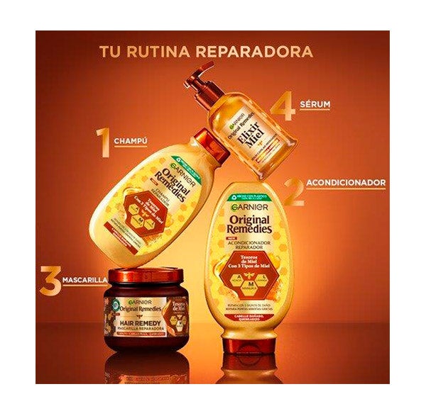 Experimenta la innovadora fórmula del Elixir de Miel Sérum Capilar Reparador de Original Remedies, diseñado para restaurar la vitalidad de los cabellos dañados. Este sérum sin aclarado de Garnier aprovecha las propiedades reparadoras de la miel para lograr resultados visibles desde las primeras aplicaciones: hasta un 94% menos de puntas abiertas, una suavidad seis veces superior y una reducción de la rotura del cabello en un 75%. También ayuda a contrarrestar los daños acumulados durante un año y protege del calor hasta 230º.