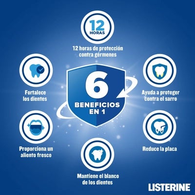 Listerine Cuidado Total Anti-sarro avanzado, su fórmula reduce la placa y previene la formación de sarro para ayudar a los dientes a mantener su blanco natural con una sensación de limpieza 3 veces más. Listerine advanced anti-sarro para sonreír con confianza. reduce la placa, una de las principales causas de la inflamaciónde las encías. protege contra el sarro para ayudar a mantener el blanco natural de los dientes. Proporciona un aliento fresco hasta 24 h duradera. Consejos de uso: usar dos veces al día. Verter 20 ml (4 cucharaditas de 5 ml) en un vaso, enjuagar dientes y encías durante 30 segundos y después escupir.