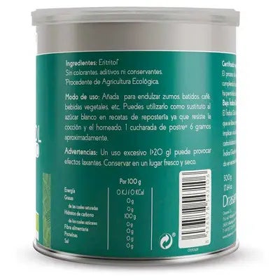 El Eritritol es un edulcorante natural, es decir, es extraído de una fuente natural. Se trata de un edulcorante bajo en calorías y recomendado para diabéticos. Además posee certificado ecológico, cumpliendo las características de los consumidores más exigentes. El Eritritol no aporta energía al organismo porque no se metaboliza, con lo cual, nuestro tracto intestinal no lo puede absorber y es eliminado. De sabor fresco, y con un poder edulcorante ligeramente inferior al de la azúcar blanca, se ha convertido en una de las alternativas saludables a nuestros platos y recetas dulces. Además, por sus propiedades se puede usar en la elaboración de recetas horneables.