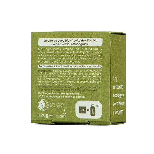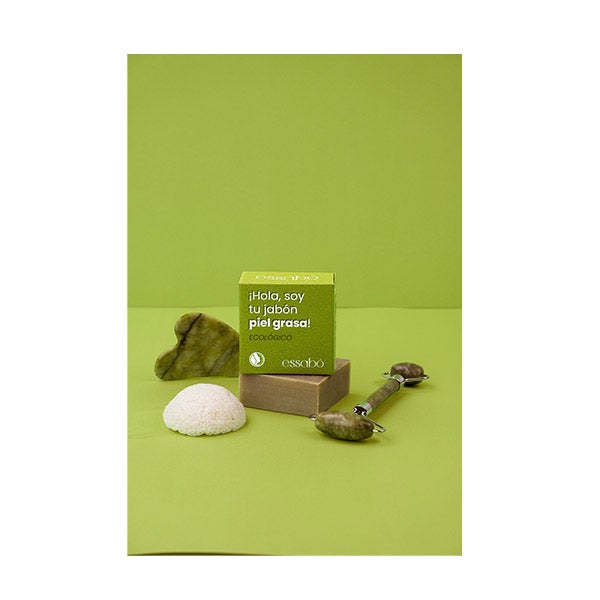 Essabó Piel Grasa es un jabón creado específicamente para quienes tienen la piel grasa o con tendencia acneica. Su fórmula incorpora arcilla verde certificada, un ingrediente que ayuda a equilibrar la producción natural de sebo y a disminuir el exceso de grasa en la piel. La base del jabón combina aceite de coco obtenido de cultivos sostenibles y aceite de oliva proveniente de agricultura ecológica española. Se elabora de manera artesanal siguiendo el proceso tradicional de saponificación en frío. Ideal para pieles mixtas o grasas con alto nivel de secreción sebácea, sudoración excesiva, brillos, poros dilatados, granitos o acné.