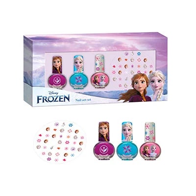 El estuche de uñas de Frozen incluye 3 esmaltes de uñas solubles en agua en fucsia, azul y rosa, así como un diseño de pegatina de la princesa Disney.