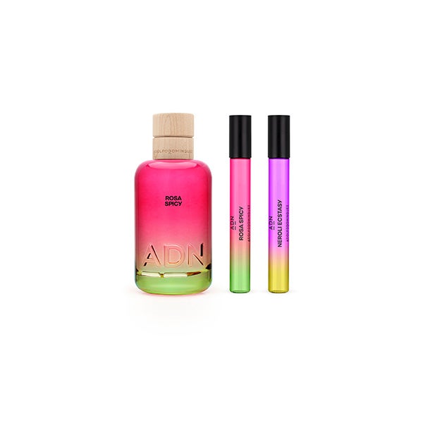 Contenido del set: Rosa Spicy Eau de Parfum vaporizador 100ml + Rosa Spicy Eau de Parfum formato viaje 10ml + Neroli Ecstasy Eau de Parfum formato viaje 10ml.