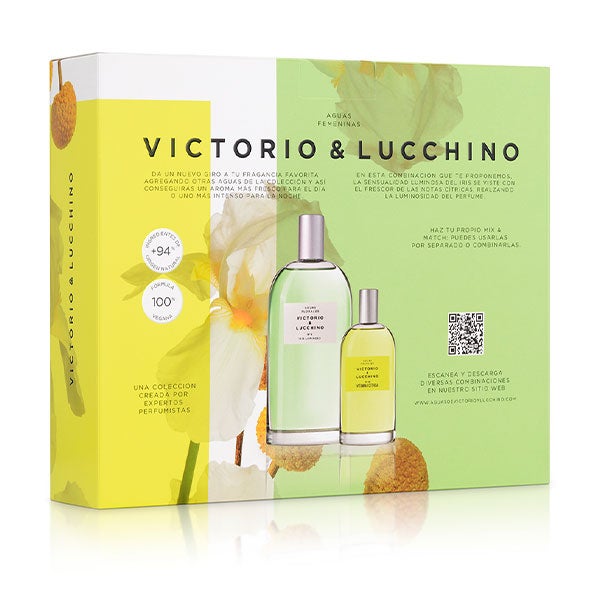 Este estuche de Victorio & Lucchino reúne una combinación única de sus Aguas Femeninas. Incluye el Agua Nº3 Iris Luminoso, de esencia pura y fresca, junto a la fragancia más envolvente, Nº15 Flor Oriental. Un set que destila sensualidad y elegancia femenina.