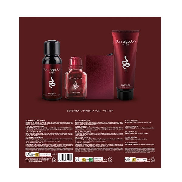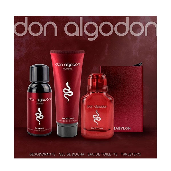 Libera tu espíritu más intrépido con el Set de Regalo Babylon de Don Algodón. Contiene la fragancia Babylon de 30 ml, un gel de ducha de 75 ml, un desodorante en spray de 100 ml y un tarjetero metálico. Un completo conjunto pensado para hombres que disfrutan cada momento al máximo.