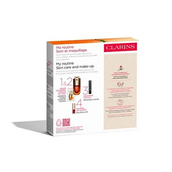 Aplica unas gotas de Double Serum sobre la piel limpia y seca, luego continúa con Double Serum Eye, distribuyéndolo con suaves toques alrededor del contorno de ojos. Extiende la Máscara Wonder Volume desde la raíz hasta las puntas de las pestañas para conseguir un efecto de volumen inmediato. Completa el look con Lip Comfort Oil, deslizándolo sobre los labios para mantenerlos hidratados y con un brillo duradero.