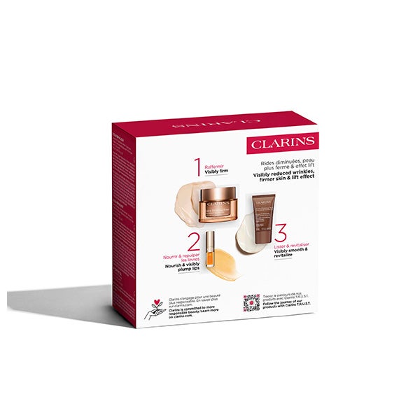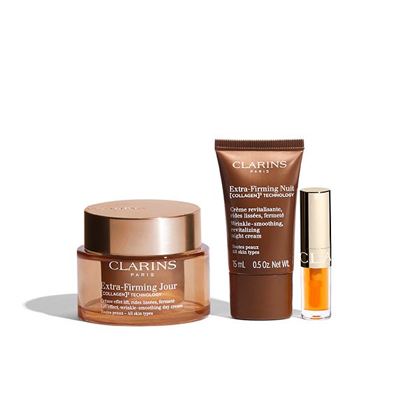 Incluye la crema Extra-Firming Día, enriquecida con extractos de canguro y mitracarpus bio, que estimula la firmeza natural, alisa los rasgos y aporta luminosidad. Se complementa con Extra-Firming Nuit y el contorno de ojos Extra-Firming Yeux en formato descubrimiento, para ofrecer una acción reafirmante continua durante el día y la noche. Además, contiene monodosis de Double Serum que refuerzan visiblemente la eficacia del tratamiento global.