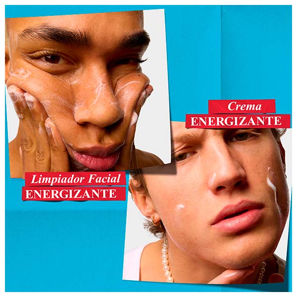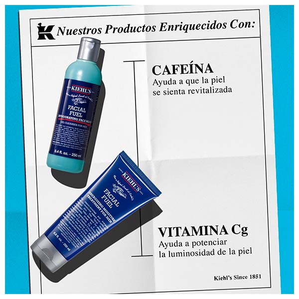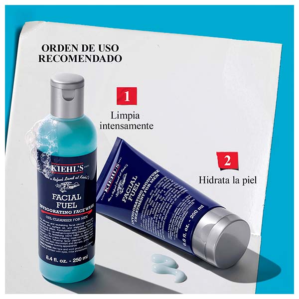 Aplica Facial Fuel Face Wash sobre el rostro húmedo y acláralo completamente. Luego extiende Facial Fuel Moisturizer sobre la piel limpia, después de la limpieza o el afeitado.