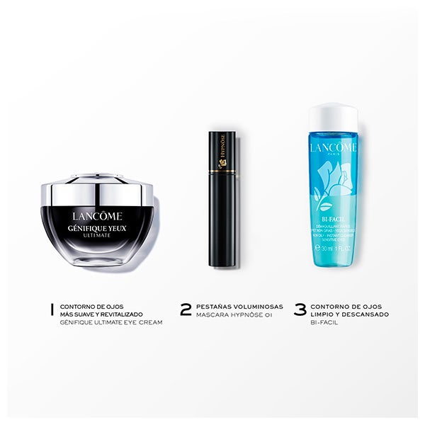 Se completa con una rutina que incorpora el Sérum Advanced Génifique, tratamiento facial avanzado antiedad con prebióticos y probióticos; la máscara de pestañas Hypnôse y el desmaquillante Bi-Facil, que limpia y refresca la piel.