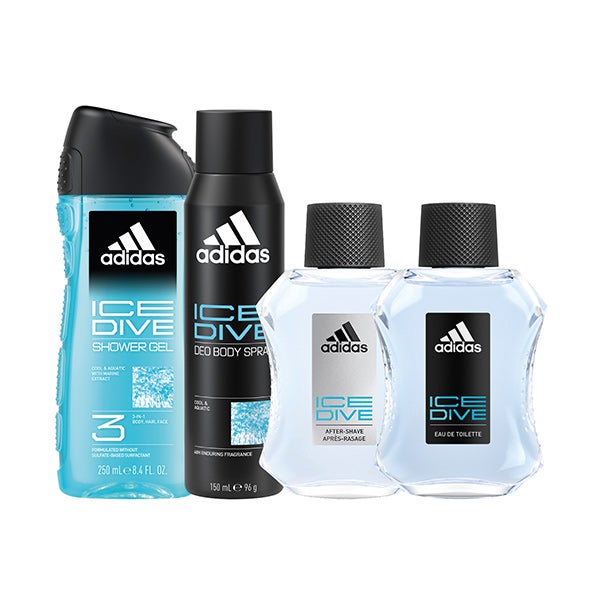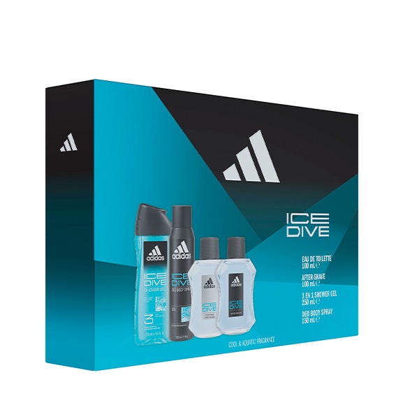 Incluye la fragancia Adidas Ice Dive Eau de Toilette de 100 ml, Desodorante de 150 ml, Gel de Ducha de 250 ml y After Shave de 100 ml.