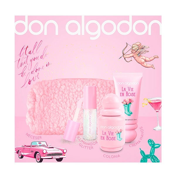 Descubre la esencia de la feminidad con el Set de Regalo La Vie en Rose de Don Algodón. Incluye la fragancia La Vie en Rose de 30 ml, un iluminador, una crema de manos aromatizada y un adorable neceser efecto borreguito. Ideal para mujeres con un estilo romántico y distinguido.