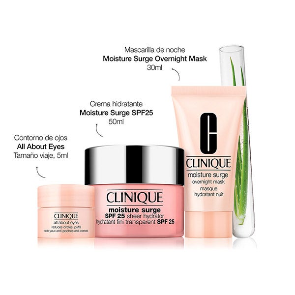 • Hidratante Moisture Surge SPF25 (50 ml, FORMATO VENTA): una crema de textura ligera tipo nube que ofrece la misma hidratación profunda de la línea icónica Moisture Surge™ junto con protección solar SPF25.