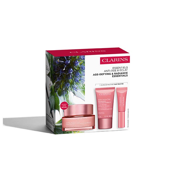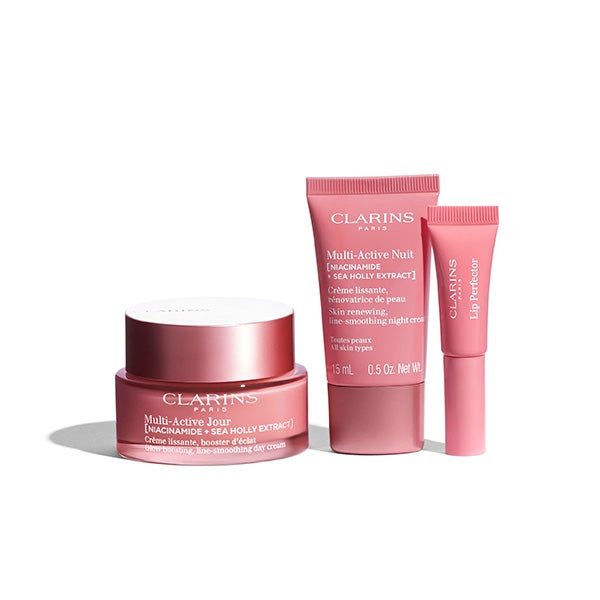 El Cofre Experto Otoño 2025 Multi-Activa Todas las Pieles de Clarins combina niacinamida y cardo marino bio para atenuar los primeros signos de envejecimiento y potenciar el resplandor natural. Contiene Multi-Active Jour Todas las Pieles 50 ml, que proporciona hidratación, suaviza la textura y revitaliza el rostro reduciendo las primeras líneas, Multi-Active Nuit 15 ml, que actúa durante el descanso nocturno para renovar y tonificar la piel al despertar, y Lip Perfector 5 ml, un cuidado de labios que aporta hidratación, reparación y un brillo voluminoso con acabado natural. Un ritual experto pensado para proteger la piel del estrés cotidiano y conservar su juventud y luminosidad, presentado en un elegante estuche de edición limitada.