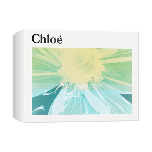 El Eau de Parfum se presenta en un frasco de líneas redondeadas, decorado con un tapón dorado y una cinta en tono rosa empolvado. Lo acompaña una miniatura de la fragancia Chloé y una loción corporal perfumada inspiradas en el cielo nocturno estrellado. Su estuche, en color marfil, se adorna con flores gráficas de tonos vivos que enmarcan delicados corazones dorados.