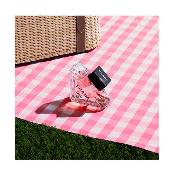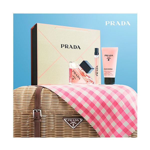 El cofre contiene un frasco recargable de 50 ml de Eau de Parfum, un formato de viaje de 10 ml ideal para acompañarte en cualquier ocasión y una loción corporal de 50 ml que nutre la piel mientras realza la persistencia del aroma. Su frasco triangular en tono rosa coral, con líneas suaves y acentos dorados, representa la visión contemporánea y audaz de Prada.