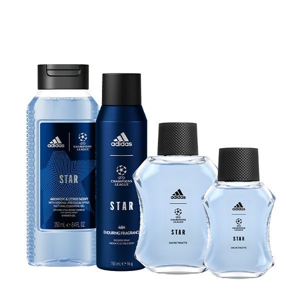 Adidas UEFA STAR es una fragancia fresca y duradera, con acordes de naranja, salvia y pimienta negra. Su aroma cítrico y aromático mantiene una sensación de vitalidad durante todo el día. Elaborada con una fórmula vegana que incorpora aceites esenciales naturales de naranja y salvia. El gel de ducha Uefa Star complementa la experiencia, ayudando a expresar tu máximo rendimiento cotidiano. Este gel limpia eficazmente y proporciona una sensación tonificante, enriquecida con aceites esenciales de naranja y eucalipto. Una esencia de frescura prolongada creada para quienes viven con pasión el fútbol.