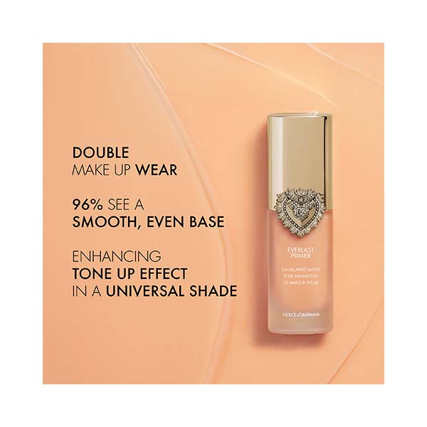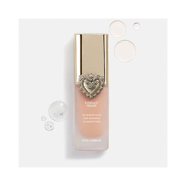 Prepara tu rostro con seguridad antes del maquillaje. Everlast Primer se presenta en un elegante frasco de vidrio con tapa dorada, decorado con el emblemático Corazón Sagrado de Dolce&Gabbana.