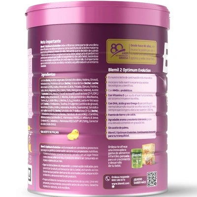 Además, Blemil 2 Optimum Evolution es fuente de vitaminas A, C y D, zinc y hierro, fundamentales para el funcionamiento normal del sistema inmune.
