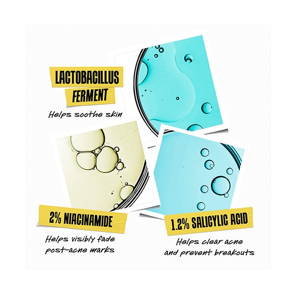 Su fórmula, con 1.2% de ácido salicílico, 2% de niacinamida, fermento probiótico de Lactobacillus y glicerina, actúa como un tratamiento diario ideal para pieles propensas al acné, ayudando a mantenerlas equilibradas y libres de imperfecciones sin resecar.
