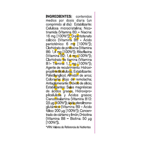Contenidos medios por dosis diaria (un comprimido al día): Estabilizante: Celulosa microcristalina; Nicotinamida (Vitamina B3 – Niacina: 16 mg [100%*]); D-pantotenato cálcico (Vitamina B5 - Ácido pantoténico: 6 mg [100%*]); Clorhidrato de piridoxina (Vitamina B6: 1,4 mg [100%*]); Riboflavina (Vitamina B2: 1,4 mg [100%*]); Clorhidrato de tiamina (Vitamina B1- Tiamina: 1,1 mg [100%*]); Agente de recubrimiento: Hidroxipropilmetilcelulosa; Estabilizante: Polietilenglicol; Almidón de arroz; Colorante: Rojo de remolacha; Antiaglomerante: Dióxido de silicio; Estabilizantes: Sales magnésicas de ácidos grasos, Hidroxipropilcelulosa y Ácidos grasos; Cianocobalamina (Vitamina B12: 2,5 µg [100%*]); ácido pteroilmonoglutámico (Vitamina B9 - Ácido fólico: 200 µg [100%*]); Concentrado de cártamo y limón; D-biotina (Vitamina B8 – Biotina: 50 µg [100%*]). *VRN: Valores de Referencia de Nutrientes