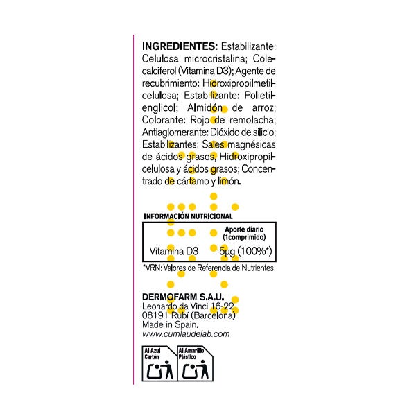 Estabilizante: Celulosa microcristalina; Colecalciferol (Vitamina D3); Agente de recubrimiento: Hidroxipropilmetilcelulosa; Estabilizante: Polietilenglicol; Almidón de arroz; Colorante: Rojo de remolacha; Antiaglomerante: Dióxido de silicio; Estabilizantes: Sales magnésicas de ácidos grasos, Hidroxipropilcelulosa y ácidos grasos; Concentrado de cártamo y limón.