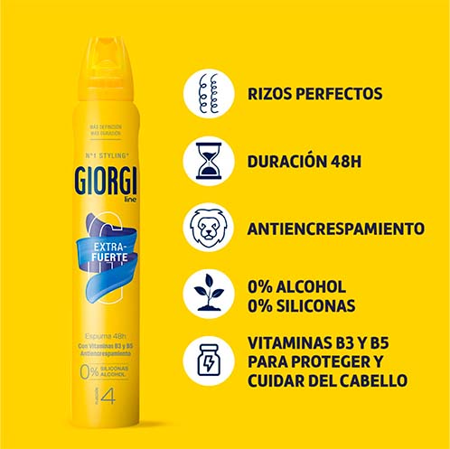 Descubre la Espuma Fijación Extrafuerte de Giorgi, diseñada para ofrecer un acabado impecable y duradero hasta 48 horas, evitando el encrespamiento y aportando hidratación intensiva gracias a sus agentes acondicionadores.