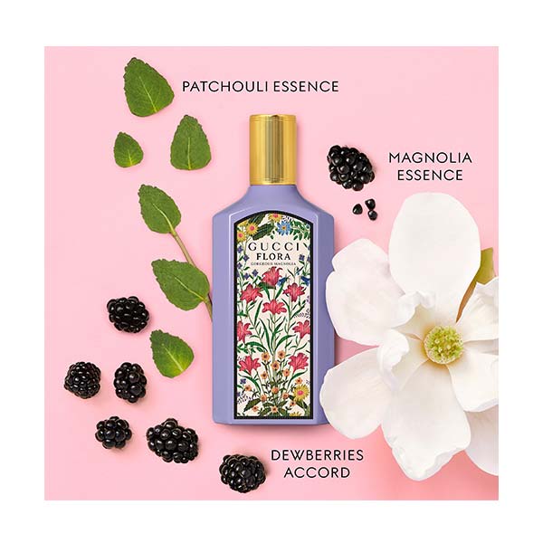 Su composición mezcla notas suaves y sensuales de magnolia, un acorde de zarzamora y la calidez del pachulí, dando lugar a una fragancia femenina y poderosa que transporta a un universo de luminoso encanto floral.