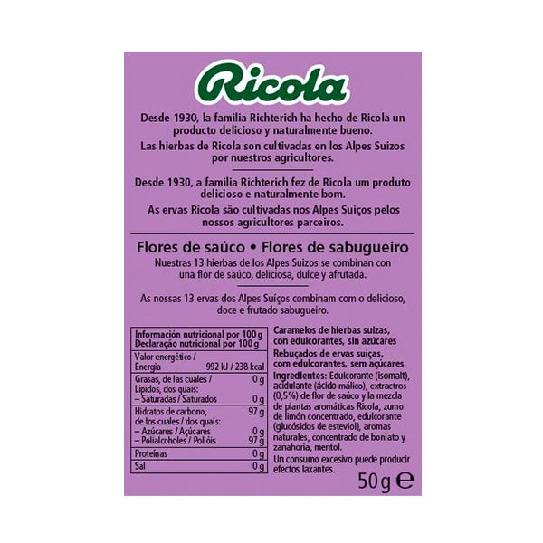 Edulcorante (isomalt), acidulante (ácido málico), extractos (0,5%) de flor de saúco y la mezcla de plantas aromáticas Ricola, zumo de limón concentrado, edulcorante (glucósidos de esteviol), aromas naturales, concentrado de boniato y zanahoria, mentol.