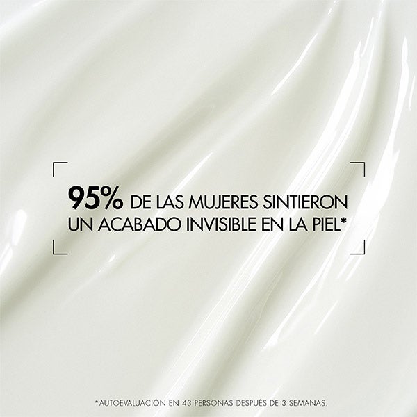 TRAS LA PRIMERA APLICACIÓN El 95 % de las mujeres notaron que el producto deja un acabado imperceptible sobre la piel. Autoevaluación realizada en 43 sujetos durante 3 semanas.